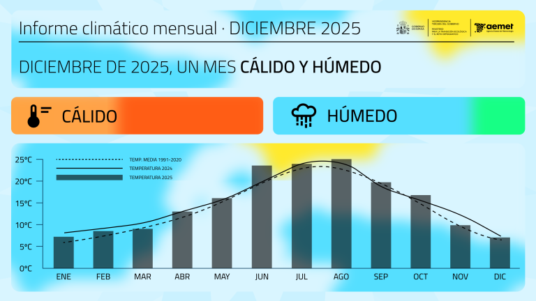 La Agencia Estatal de Meteorología (AEMET), dependiente del Ministerio para la Transición Ecológica y el Reto Demográfico (MITECO), ha hecho público el avance climático de diciembre de 2025, que mostró un carácter cálido en cuanto a temperaturas y húmedo en precipitaciones.