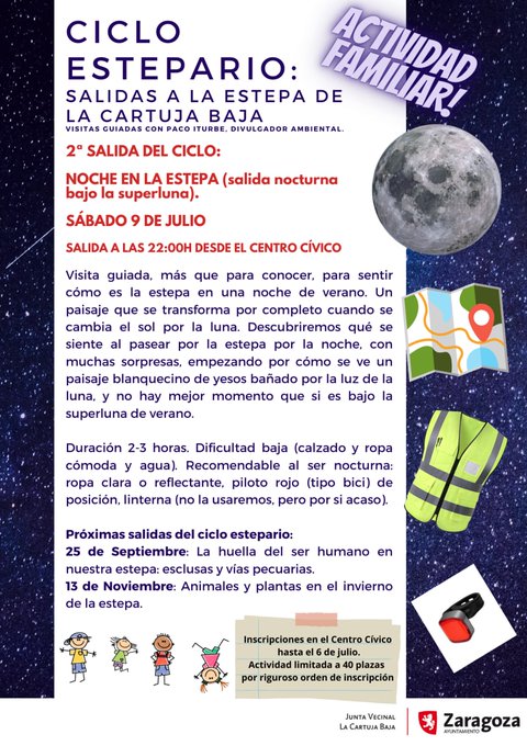 Visita guiada más que para conocer para sentir cómo es la estepa en una noche de verano. Unpaisaje que se transforma por completo cuando se cambia el sol por la luna. Descubriremos qué se siente al pasear por la estepa por la noche con muchas sorpresas, empezando por cómo se ve un paisaje blanquecino de yesos bañado por la luz de la luna, y no hay mejor momento que si es bajo la superluna de verano.