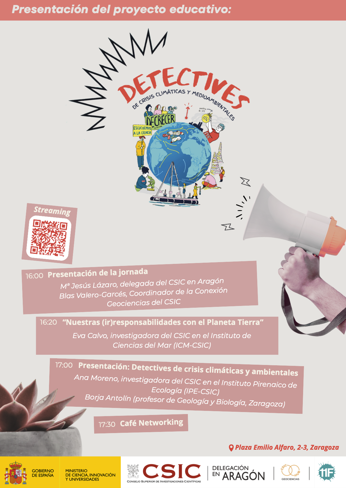 Se trata del proyecto “Detectives de crisis climáticas y medioambientales”, realizado por un grupo de científicas de diversos centros del CSIC en colaboración con profesorado de secundaria, enmarcado en la conexión de Geociencias para un planeta sostenible. Proponemos de manera rigurosa y divulgativa seis sesiones de trabajo para entender el cambio climático y otros problemas ambientales actuales con base en las Geociencias, como la contaminación de suelos y playas, la acidificación del océano o la escasez de recursos hídricos. Las sesiones incluyen vídeos explicativos basados en la investigación actual del CSIC en esta disciplina, actividades para realizar por parte del alumnado e ideas para reflexionar en clase en torno a las crisis climáticas y medioambientales. Pensamos que todo este material no tiene porqué usarse solo en clase y puede ser válido para atividades de educación “no formal”.