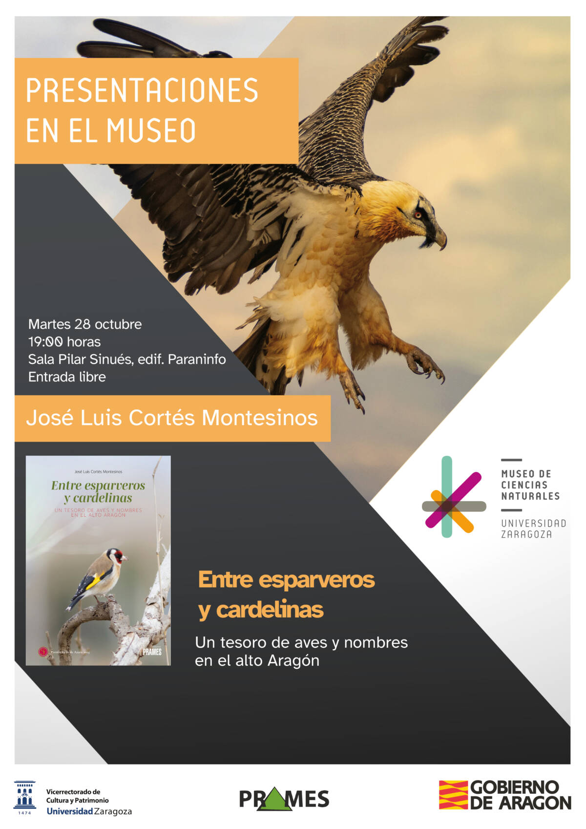 El próximo martes 28 de octubre tendrá lugar en el MCNUZ la presentación del nuevo libro de José Luis Cortés Montesinos “Entre esparveros y cardelinas. Un tesoro de aves y nombres en el Alto Aragón”.