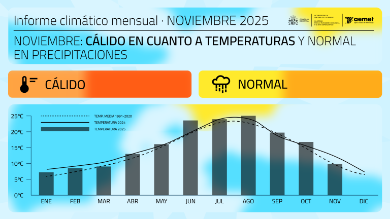 La Agencia Estatal de Meteorología (AEMET), dependiente del Ministerio para la Transición Ecológica y el Reto Demográfico (MITECO), ha hecho público el avance climático del pasado mes de noviembre, que mostró un carácter cálido en cuanto a temperaturas y normal en precipitaciones.